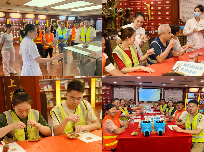 在中医药博物馆内,他们在专业药师的引领下,见识了栩栩如生的梅花鹿皮毛标本、庄严肃穆的名医塑像以及种类繁多的中药材标本。我院药师积极引导大家借助嗅闻和品尝有酸、苦、甘、辛、咸不同味道的中药来学习如何区分中药的种类,同时指导他们制作具有提神功效的香囊。在中建三局二公司的职工们了解制作香囊所需的多种药材以及具体的克数后,他们将药材进行称重并研磨捣碎,最后把药材一点一点地装入料包袋中。这些香囊不仅凝聚着大家的辛勤付出,更承载着他们对中医药文化的深深热爱与传承之心。