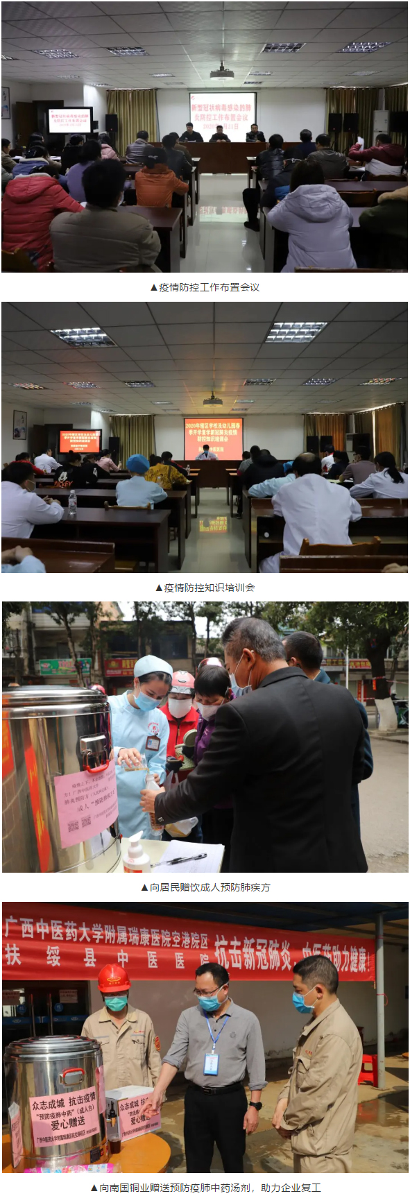 疫情之初,按照上级的部署,院区成立了以执行院长及总支书记为第一责任人的新冠肺炎疫情联防联控工作领导小组及疫情联防联控办公室,除了强化院内患者、职工疫情防控外,还具体负责扶绥县火车站体温监测点、全县密切接触者集中隔离观察点、县城居民点上门排查等工作。截止2020年9月底,火车站体温检测点总共检测9万余人,其中发现体温异常4人。从2020年1月开始派出6名医护人员负责密切接触者集中隔离(扶绥县党校)观察点的具体工作,已总计隔离排查人员150余人(工作目前还在进行中)。“五盯一”网格化管理人员总共入户162户,监测211人;追踪门诊发热病人543人,体温异常人员113人,专人专车转运人员共7人。院区为扶绥多个机关事业单位、企业、学校免费提供防治疫情的中药汤剂。出色地完成工作,未发生差错,受到当地政府的好评。
