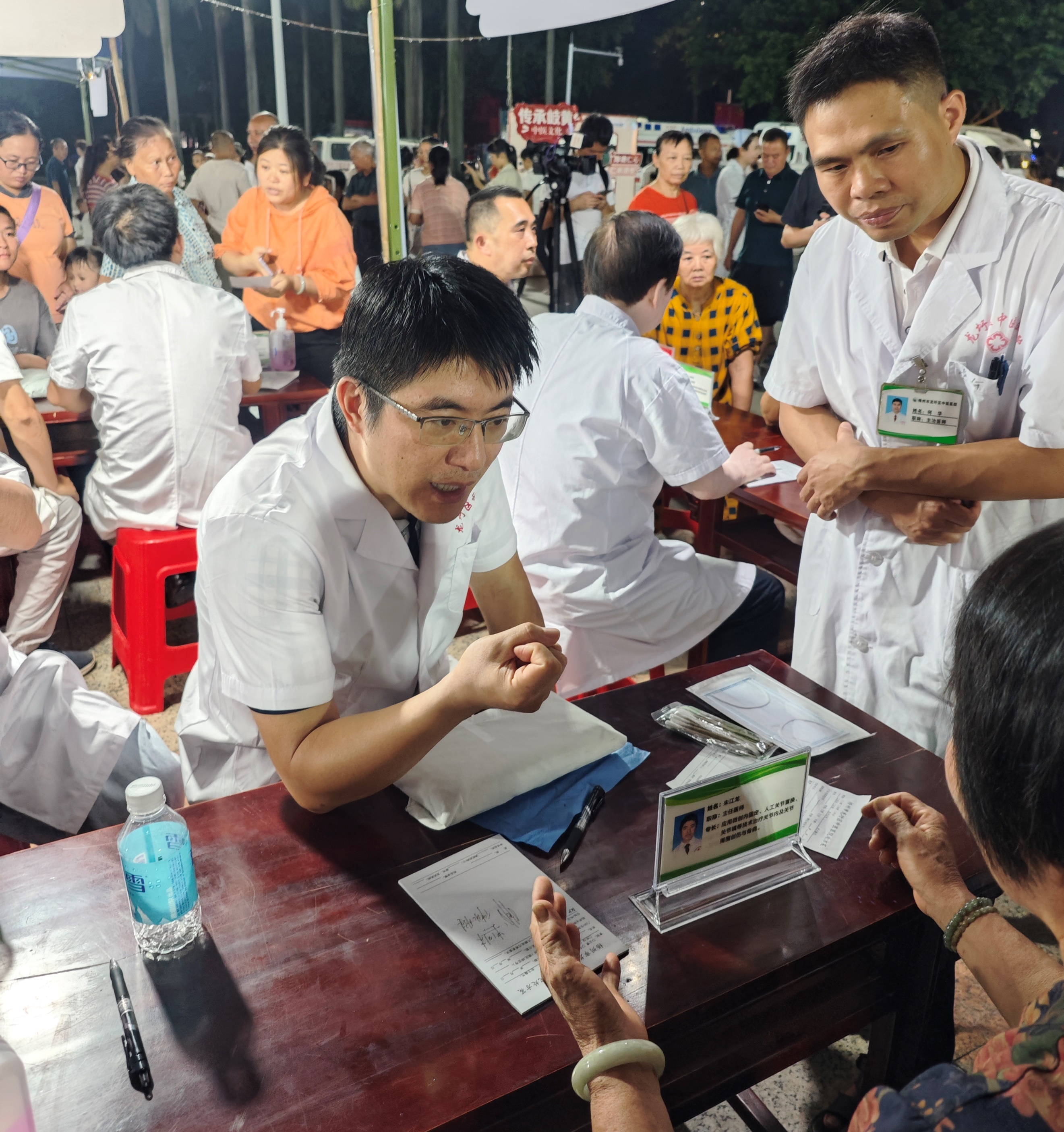 10月19日晚,黄有荣教授及其团队成员朱江龙主任医师、章晓云副主任医师、丰新健副主任医师以及蓝崇主治医师,参加梧州市龙圩区中医文化之夜义诊活动。专家团队为居民群众问诊号脉、体质辨识、辨证开方,并给予个体化的中医治疗和调理指导。活动从19时开始,原本计划21时30分结束,但由于前来就诊人数较多,黄有荣教授不间断地为群众看病至深夜23时多,诊疗服务人数达100余人。