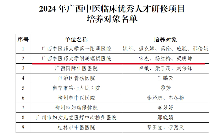 近日,自治区中医药管理局公布《2024年广西中医药优秀人才培养对象名单的通知》,我院宋杰、杨红梅、梁明坤入选2024年广西中医临床优秀人才研修项目培养对象,梁国成入选2024年广西中药优秀人才研修项目培养对象,并获得2024年广西中医药优秀人才研修项目经费支持。