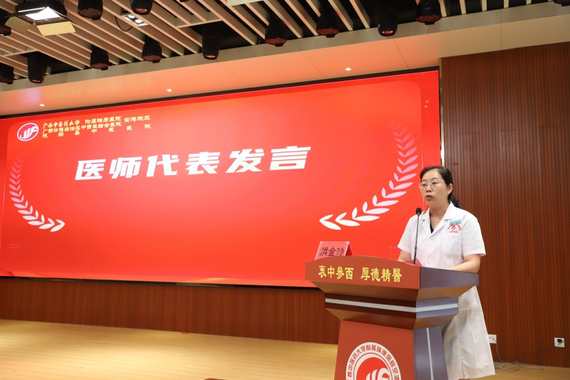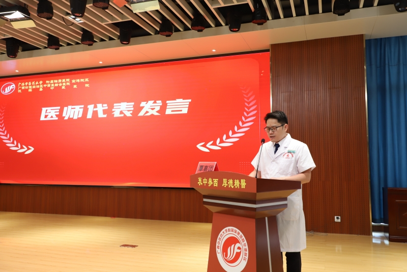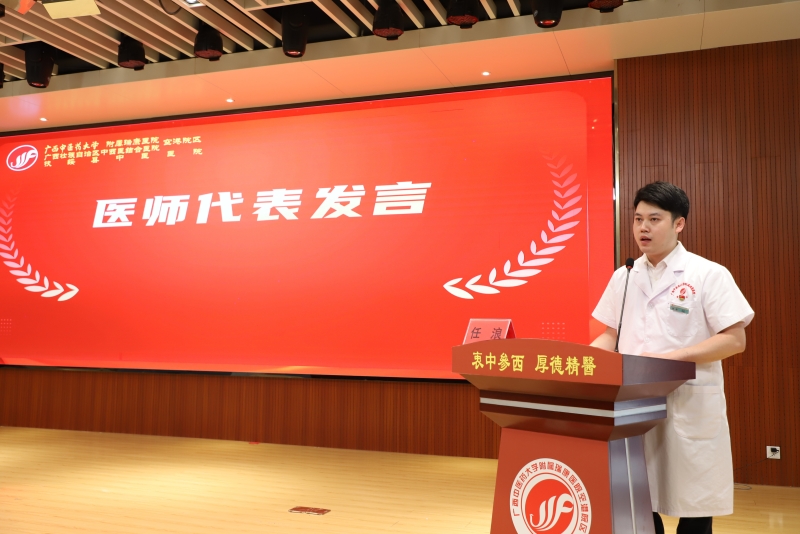 医师代表肿瘤科覃喜团、儿科洪金玲、外科一区任浪上台发言,以真挚的情感分享了从医路上的坚守与感悟,表达了对职业的热爱和对医院培养的感恩,以及继续为守护人民健康不懈奋斗的决心。
