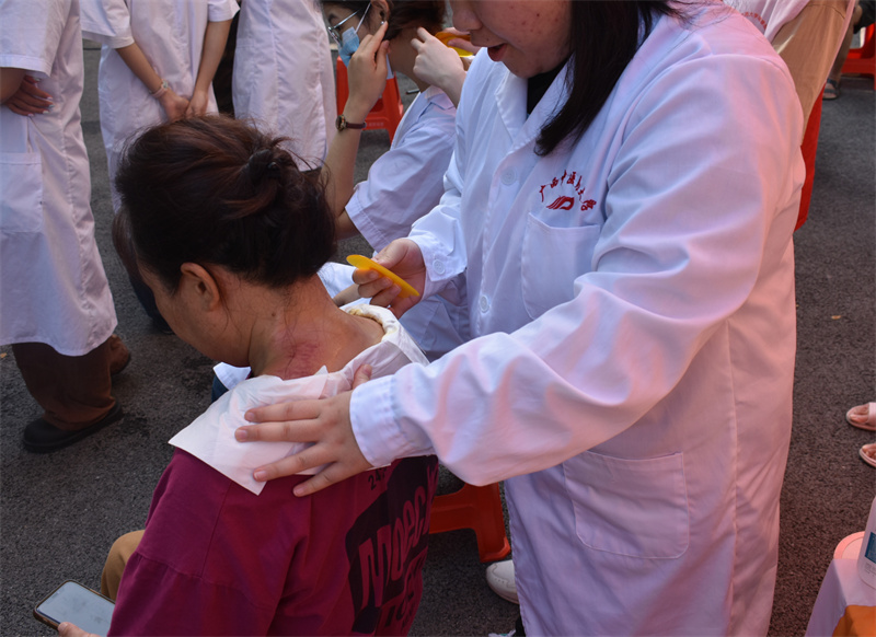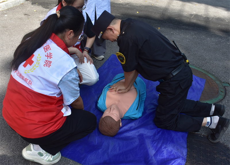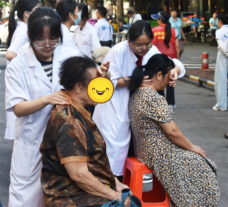 活动现场设置血压测量区、艾灸区、推拿区、急救知识科普区等多个功能区,吸引了众多居民前来体验。在血压测量区,志愿者们为居民提供免费血压检测,并根据检测结果给予相应的健康建议;艾灸区和推拿区则受到了许多中老年居民的欢迎。志愿者们运用所学中医知识,为居民进行艾灸和推拿服务,缓解他们的肩颈酸痛、腰腿不适等问题,不少居民表示体验后感到明显放松;在急救知识科普区,志愿者通过现场演示和讲解,向居民普及心肺复苏、海姆立克急救法等基本急救技能,增强了大家应对突发情况的能力。