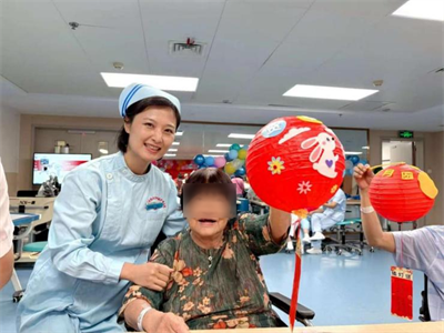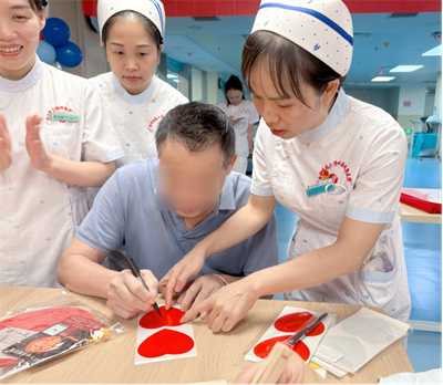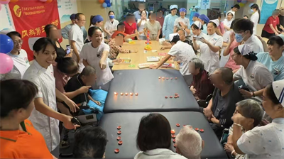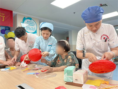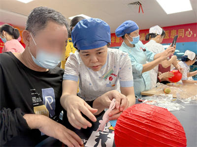 手工体验区同样是一片热闹非凡的景象。医护人员提前准备好了国旗贴纸、灯笼骨架以及色彩斑斓的彩绸,手把手耐心地教大家制作“迷你国旗”与“中秋月兔灯”。患者们还将自己愿望写在花灯上,一笔一划间,充满了对生活的热爱和对早日康复的期待。患者李阿姨把亲手做好的灯笼高高举起,感动的说:“住院也不觉得孤单了,我们就是一家人!”