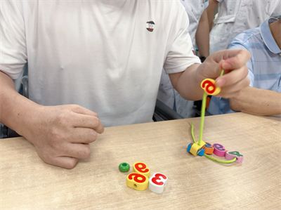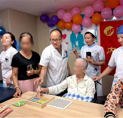 紧接着,趣味竞技环节热闹开启,共设置 “穿针引线”“套圈达人”“穿衣竞赛”“吹蜡烛”“夹珠球” 五个妙趣横生的项目。“预备 —— 开始!”随着裁判口令落下,“穿衣竞赛”中,肢体偏瘫患者需独立完成“患侧先穿 - 健侧后穿 - 系纽扣 - 拉拉链”四步动作,用时最短者获胜。对普通人而言简单的流程,却是他们每日必练的“生活技能”。65岁的赵叔叔率先完赛,激动地说:“这是我生病后第一次觉得自己还能‘赢’!”观众席随即响起热烈掌声。72岁的龙奶奶则在“夹珠球”中夺魁,她高高举起奖品,像孩子般开心:“原来康复训练能这么好玩!做游戏时我完全忘了自己是病人,这活动又练又玩,太有意义了!”此外,训练手部肌力与协调性的“套圈达人”、锻炼呼吸功能的“吹蜡烛”,均深受病友喜爱;患者、家属与医护人员还组队参赛,现场加油声、欢笑声不断。这场竞技让我们真切看到:功能障碍不是人生“终点”,只要每天进步一点点,生活就能重新“靓”起来!