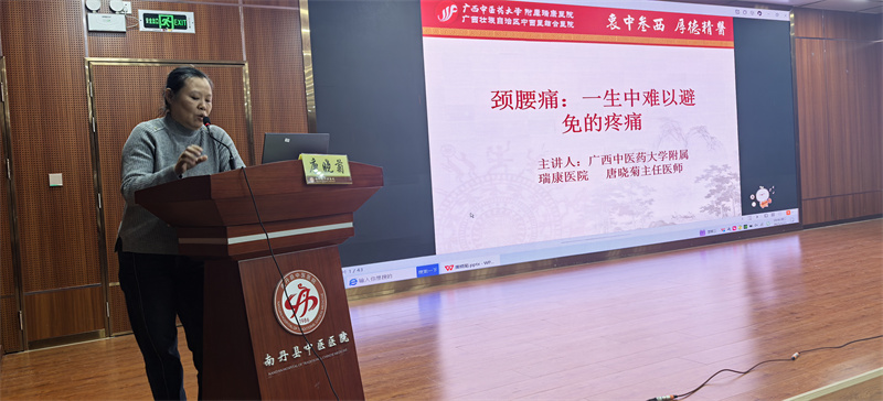 12月3日下午,专家团队首先为南丹县中医医院医护人员举办了一场内容丰富的学术讲座。陈黎教授介绍了本科室优势病种的诊疗方案,并详细解析了科室常用治疗肝病的8种膏方;唐晓菊教授作《颈腰疼:一生中难以避免的疼痛》专题分享,针对现代人因长时间使用手机导致的颈腰椎问题,从疾病形成、治疗到保健进行了系统讲解;何国珍教授带来《肺癌的免疫靶向治疗》专题讲座,从病理学角度深入剖析肺癌分类、诊治方案及前沿免疫治疗进展;周英惠教授则围绕妇科常见病,讲解了《中国内膜息肉的诊治》,系统介绍了子宫内膜疾病的诊疗规范。专家们结合临床实践与前沿成果,授课内容深入浅出、条理清晰,现场医护人员纷纷表示受益匪浅,为今后工作提供了宝贵借鉴。