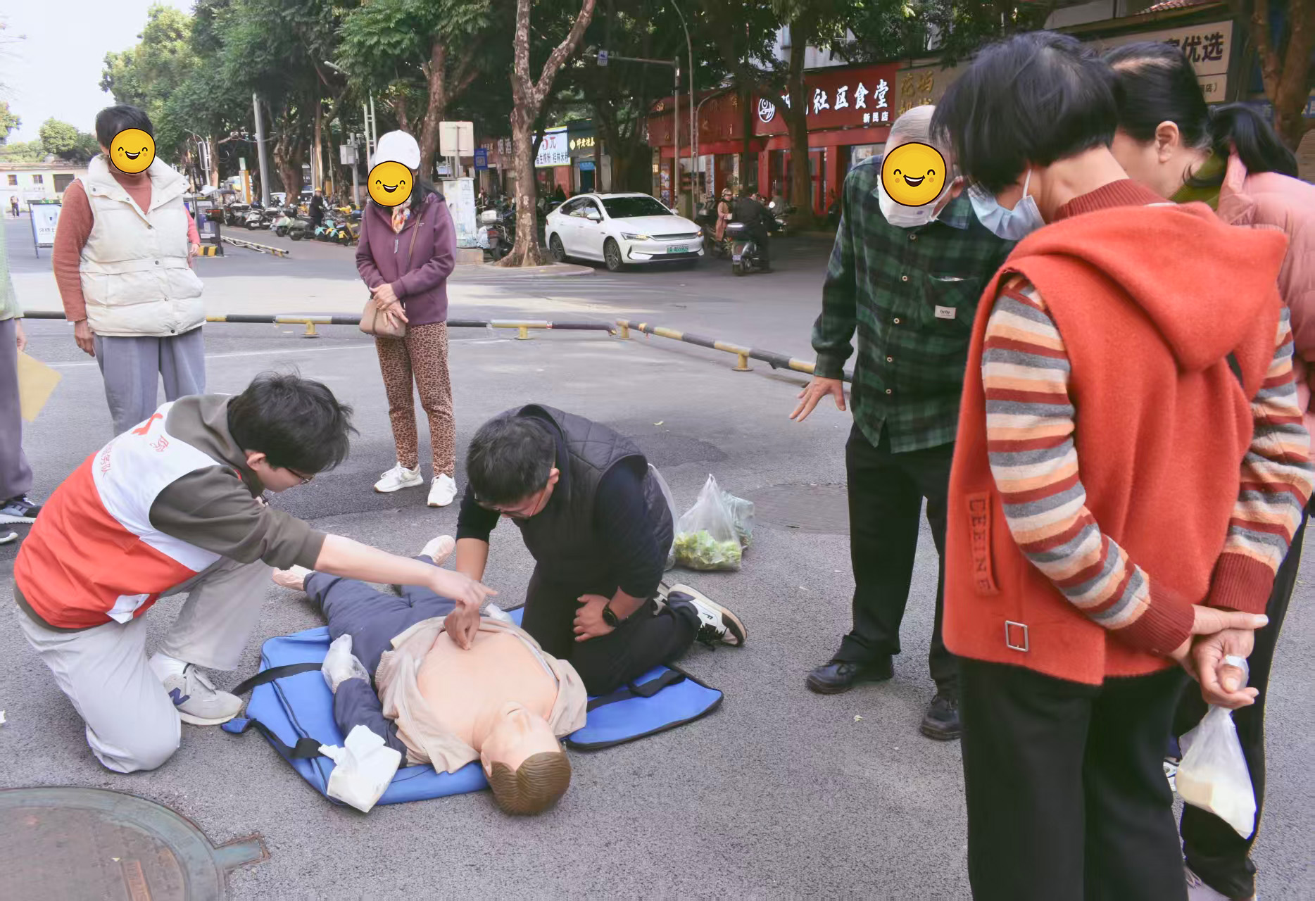 活动现场,前来参与义诊的居民络绎不绝。志愿者们面带微笑、耐心引导,协助居民有序排队等候。此次义诊服务内容丰富多元,不仅提供艾灸、刮痧、手法按摩等中医特色理疗服务,还为居民测量血压、普及科学降压知识,并同步开展急救知识宣讲。前来咨询的居民以中老年人为主,志愿者们细致询问身体状况,结合专业知识为居民提供一对一的中医理疗服务,通过点按、揉推、拍打等手法疏通经络、缓解不适。在急救知识宣讲环节,志愿者现场演示心肺复苏操作,手把手指导居民实践练习,帮助大家切实掌握应急救护技能。