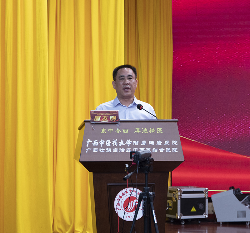 在开幕式上,我院院长唐友明在致辞中代表医院领导班子和全体职工对专家学者们的到来表示热烈欢迎和衷心感谢,对广西中西医结合学会重症医学专业委员会的成立表示祝贺。他指出,祖国中医药医学博大精深,是中华民族的伟大创造和科学瑰宝,在这次新冠疫情中,中医药早期介入,全程参与,在各阶段都发挥了极其重要作用,特别是对于急危重症患者采取中西医结合治疗疗效显著,彰显了是中医药的特色和优势,是这次抗疫的亮点。他表示,习近平总书记高度重视中医药发展,“传承精华,守正创新”是习近平总书记对中医药工作作出的重要指示,广西中西医结合学会重症医学专业委员会的成立是我院顺应新时代、新形势、新使命,大力推进公立医院高质量发展的具体举措,他希望该以此为契机,联合全区的各级力量,共同推进中西医结合重症医学的发展,为进一步充分发挥中西医结合救治危重症的特色与优势将提供强有力的技术保障,为广西培养中西医结合重症医学人才搭建良好的交流平台,共同为广西中西医结合重症医学事业的发展作出积极贡献。