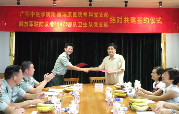 座谈会上还举行了广西中医学院附属瑞康医院骨科党支部与驻防城港75475部队卫生队党支部“结对共建”签约仪式。