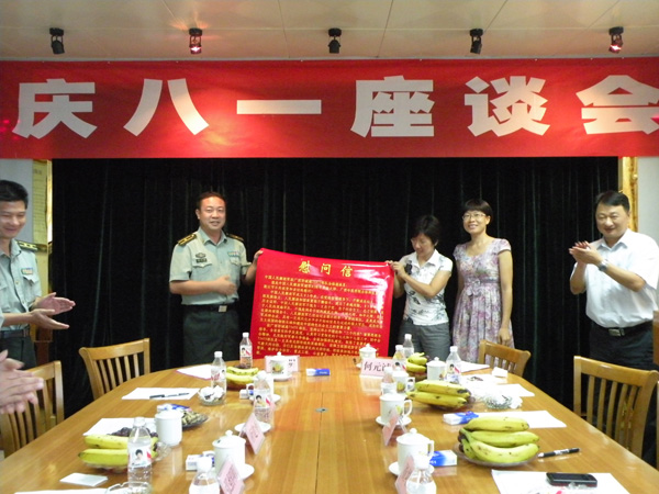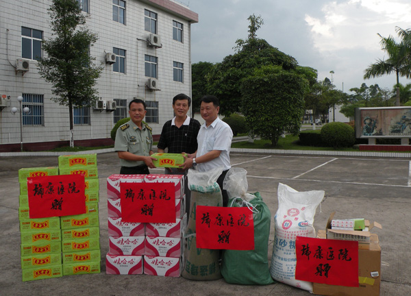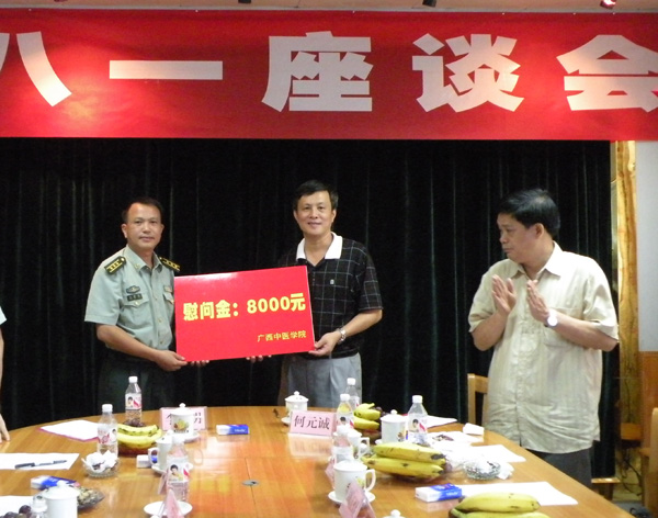 2010年7月22日下午,在第83个建军节到来之际,广西中医学院党委副书记董塔健率领由学院党委办公室、武装保卫部、附属瑞康医院等部门领导组成的慰问团一行20多人顶着烈日酷暑赴防城港慰问中国人民解放军75475部队官兵。我院向部队官兵们赠送慰问金、慰问信及价值4000元的慰问品及药品。