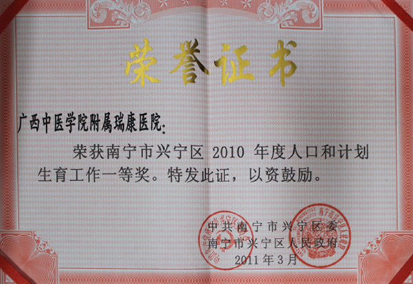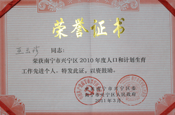 2010年3月7日,南宁市兴宁区党委、政府决定对2010年区间城市人口计生工作目标责任制党政线、计生线、部门线执行情况考核评估获奖单位给予通报表彰。我院荣获考核评估辖区单位组一等奖;我院预防保健科巫玉珍同志获“兴宁区2010年人口计生工作先进个人”荣誉称号。