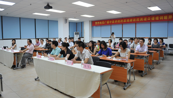 经过多方筹备,2011年5月9日,由我院主办,广西中洲国际培训学院承办的瑞康医院英语口语强化培训班正式开班。原广西中医学院副院长、现广西中医学院副厅级调研员邓家刚,原教育厅副厅长、现中洲国际培训学院院长车芳仁,我院党委副书记陈日兰,我院副院长叶日乔,中洲国际培训学院董事长颜昌荣,中教授课老师杜航,外教授课老师飞飞以及第一批英语口语强化班学员参加了开班仪式。开班仪式由叶日乔副院长主持。
