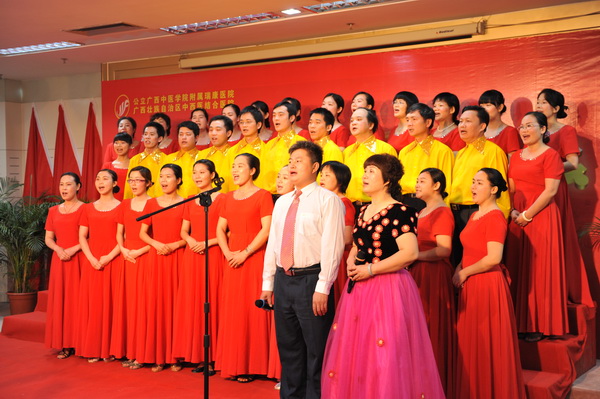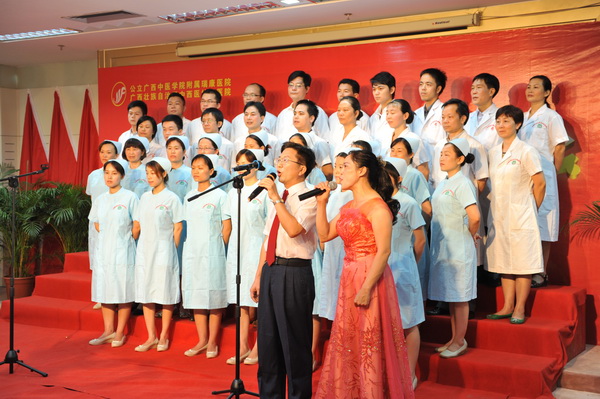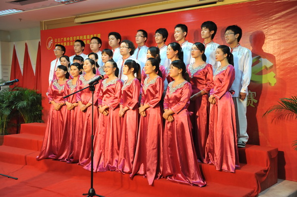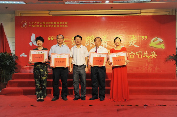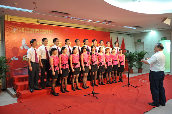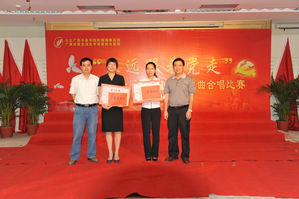 2011年6月3日下午,主题为“永远跟着党走”的庆祝建党九十周年红色经典歌曲合唱比赛在我院23楼学术报告厅拉开帷幕。广西中医学院组织部副部长蒋子华、宣传部副部长蒋闽义,我院副院长张春、庞刚等领导和我院13支参赛队伍以饱满的激情为党的九十周年生日献上了一份真诚的祝福。
