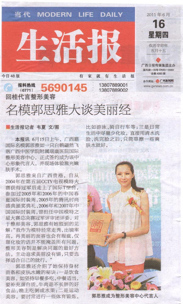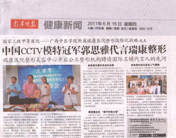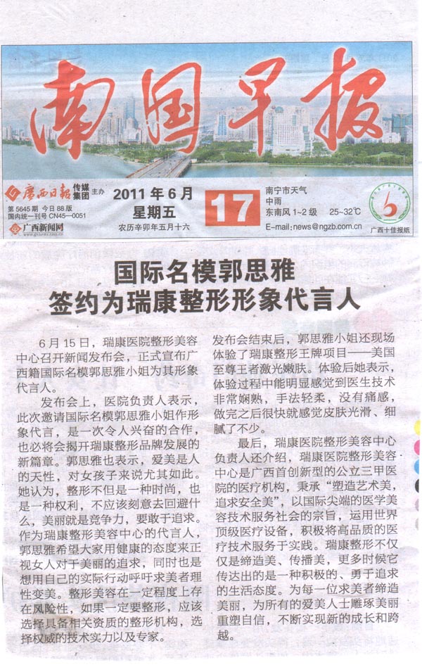 2011年6月15日,瑞康医院整形美容中心召开新闻发布会,正式宣布广西籍国际名模郭思雅小姐为其形象代言人。发布会吸引了广西电视台、南宁电视台、南国早报、南宁晚报、当代生活报、南国健报以及广西新闻网等区内主流媒体争相报道。
