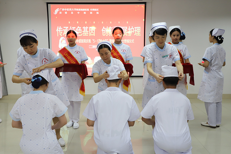 授帽仪式上,院区护理部主任王艳红、护理部副主任李雄群、外科护士长梁其凤、3位高年资护理前辈为新入职的护士们依次佩戴象征着白衣天使崇高使命的燕尾帽和传递烛火。