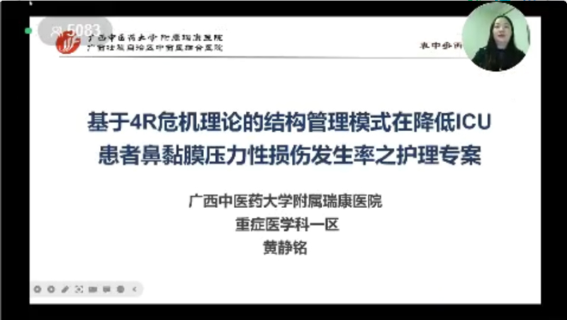 12月15-16日,由广西护理质控中心主办的2022年护理管理新进展学习班暨第十届广西护理质量改善成果展示会在南宁举行,包括14家区直医院在内的区内56家医疗单位提交护理质量改善项目参加展示和评选。其中,我院重症医学科一区护理质量改善项目“基于4R危机理论的结构管理模式在降低ICU患者鼻黏膜压力性损伤发生率之护理专案”荣获广西护理质量改善成果汇报展示奖。