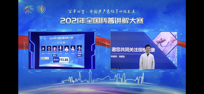 本届大赛主题为“百年回望:中国共产党领导科技发展”,分半决赛和总决赛两个赛段,首次采取全程线上视频展示结合线下专家评审的形式举行。参赛选手由国家部委、军队、各个地方组织选拔推荐。大赛评委组由中国科学院院士苏国辉等22名专家组成,集中通过视频和实时连线的方式,观看选手们限时4分钟的自主命题讲解展示,分别从内容陈述、表达效果和整体形象三方面进行评分,选出大赛各个奖项。来自全国各地76个代表队232名选手通过网络视频连线的方式比拼展示,历经了全国半决赛,最后进入决赛的全国30强选手展开激烈角逐,我院国医大师馆刘昊医师代表广西首次入围该项比赛总决赛。
