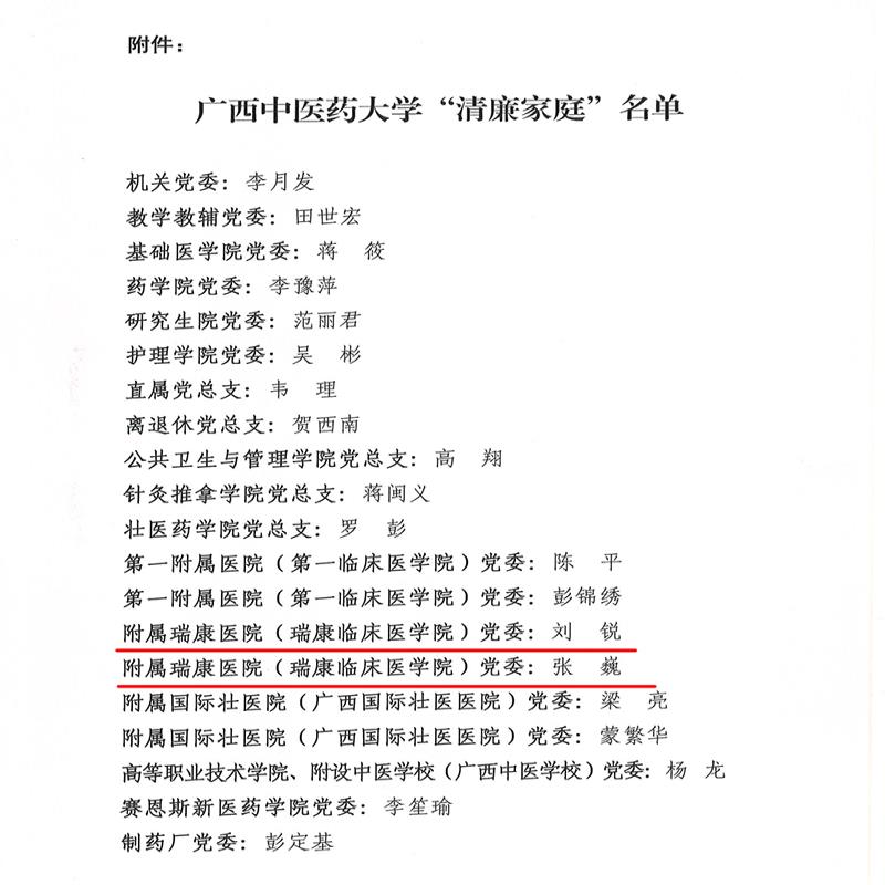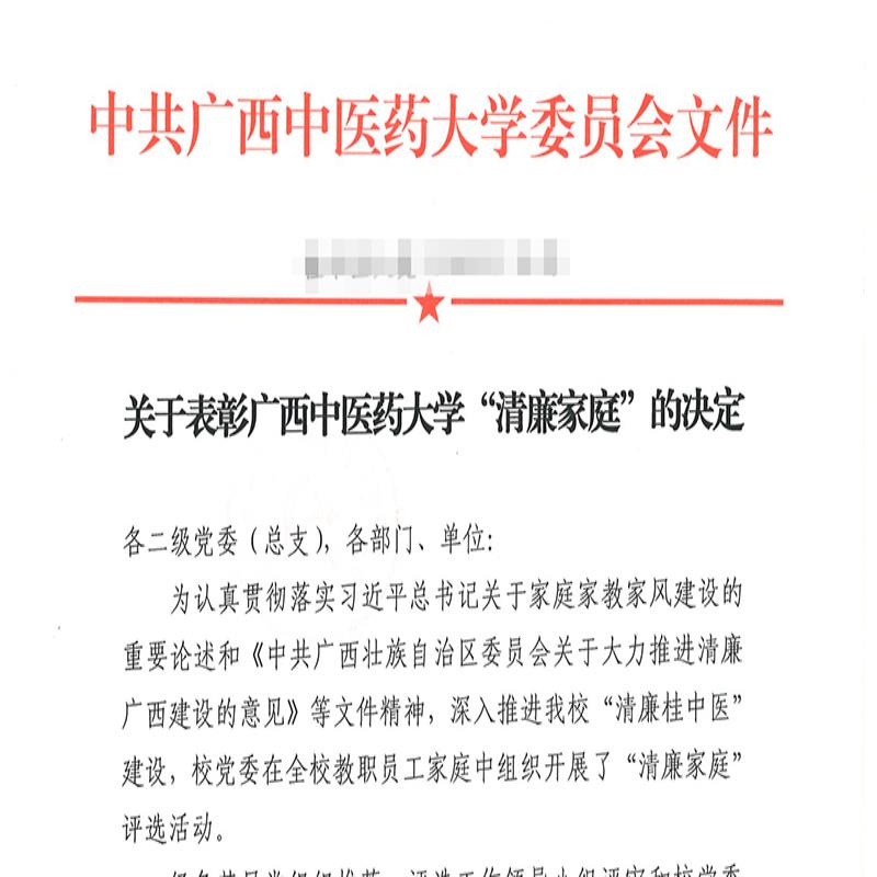 为认真贯彻落实习近平总书记关于家庭家教家风建设的重要论述和《中共广西壮族自治区委员会关于大力推进清廉广西建设的意见》等文件精神,深入推进“清廉桂中医”建设,校党委在全校教职员工家庭中组织开展了“清廉家庭”评选活动。院党委高度重视,精心组织,积极参与,在各党支部组织推荐的基础上,经组织审查、择优推荐张巍刘锐两个家庭参评。近日,在学校“清廉家庭”评选中,两个家庭均被授予广西中医药大学“清廉家庭”荣誉称号。