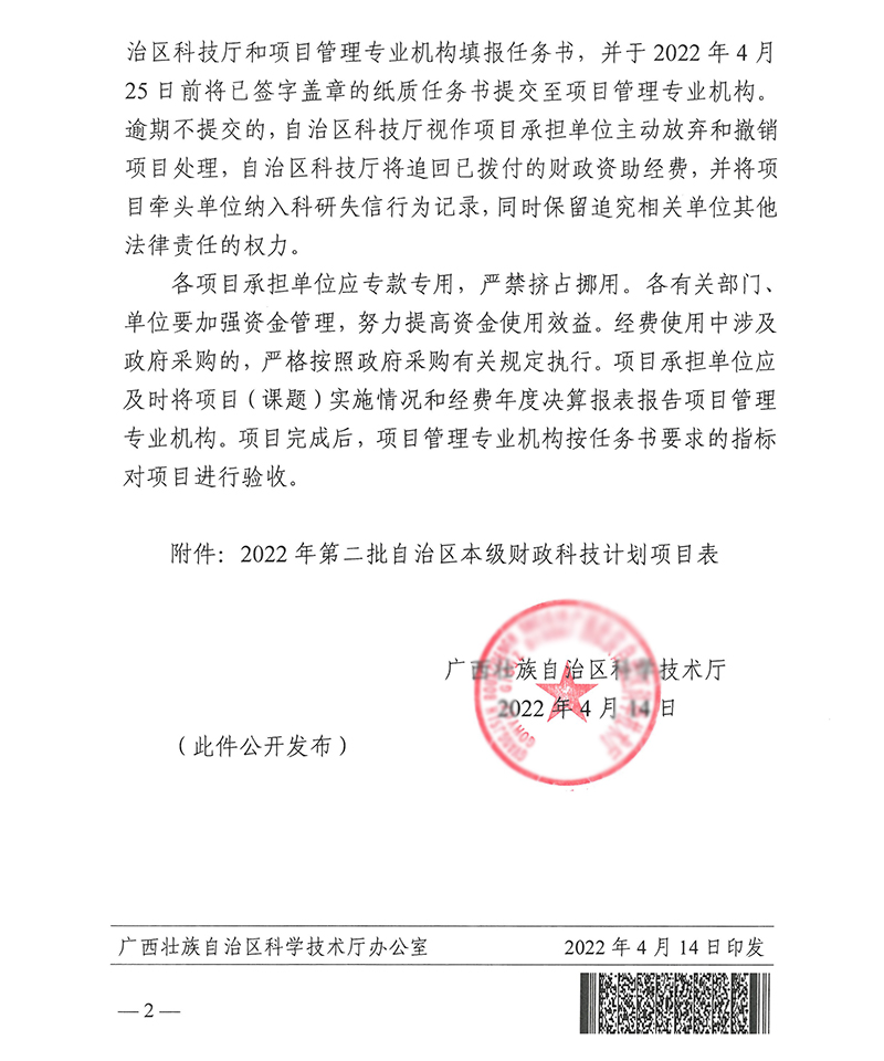 4月14日,自治区科技厅下发《自治区科技厅关于下达2022年第二批自治区本级财政科技计划项目的通知》,本批项目包括广西重点研发计划、广西科技基地和人才专项、广西技术创新引导专项和广西自然科学基金项目共133项,共资助经费48676.6万元。其中,我中心——广西中西医结合肾脏疾病临床医学研究中心获得项目资助经费300万元。