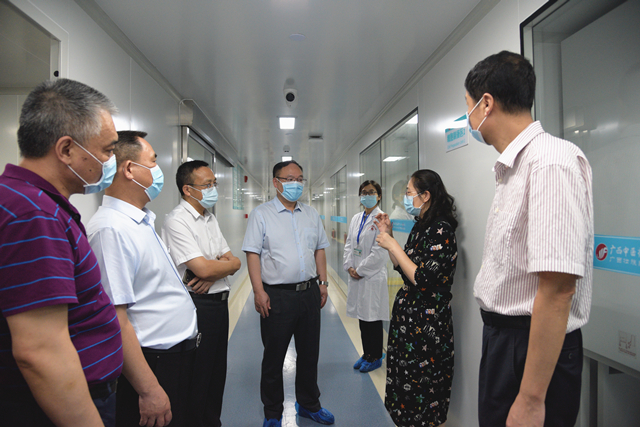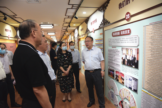 曹坤华在调研期间听取了我院院长唐友明汇报医院科研团队基本情况,分别到广西中西医结合转化医学中心、国医大师馆、陈可冀院士工作站、院史馆、治未病中心、国医堂名医馆、射波刀治疗中心等科室参观指导。曹坤华通过实地考察与交流,对我院科研氛围的营造、科技创新风貌的形成、科研成绩的取得作了充分肯定,赞扬了我院科研氛围浓厚,具有一定的科研功底及优越的科研条件。他指出,创新是引领发展的第一动力,自治区党委、政府高度重视科技创新工作,陈可冀院士工作站、广西中西医结合转化医学中心是广西科技创新的重要平台,一定要结合全区创新驱动发展战略和科技创新工作部署,主动对接产业升级优化,引才聚力,服务地方经济发展,在此同时要平衡好临床与科研的协调发展,加强人才引进与培育相结合,打造一批高水平的科研创新团队,实现“项目、平台、人才”一体化发展。当前,民生幸福、大健康产业发展和抗疫防疫都对生物医疗技术提出了新要求,医院有一支充满朝气的科研骨干团队,希望能不断拓宽院外合作渠道,承担更多责任和使命,并及时将科研成果转化应用,促进经济社会发展。同时他希望医院注意整合一些优势项目,突出重点,把科研工作做出品牌,对全区临床医院的科研工作能起到引领和带动作用。科技厅将积极支持医院,加大对医院的科研平台构建、科研团队建设、领军人才引培、项目经费支持等方面的支持力度,进一步做好服务医疗卫生发展的各项工作。