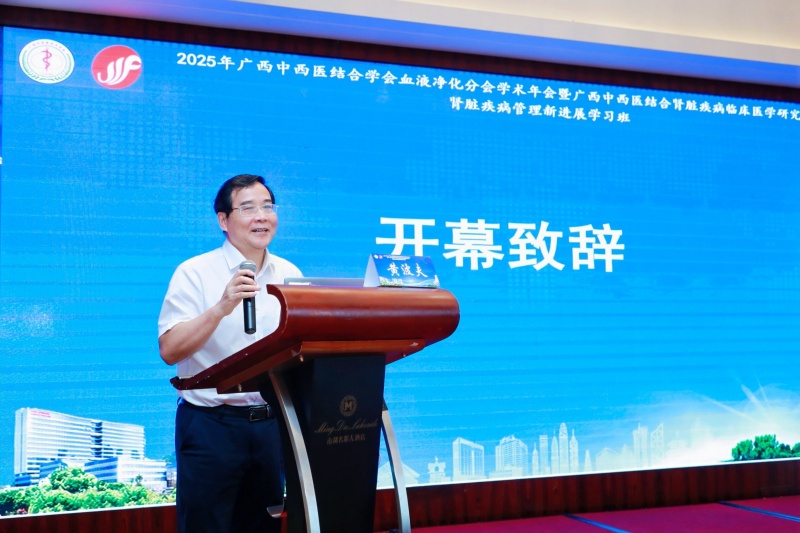 黄波夫在致辞中表示,在我国,肾病患者数量庞大,每年有无数家庭因肾病而承受着巨大的身心压力,血液净化技术是现代医学为肾病患者点亮的一盏希望之灯,它不仅关乎技术的进步,更是对每一位肾病患者生命尊严的深切关怀;希望本次大会的深入交流与探讨,能够激发更多创新思维,共同推动血液净化技术及其中西医结合应用迈向新的高度,为广西乃至全国的肾病患者提供更加优质的医疗服务,为“健康中国”战略贡献智慧与力量。