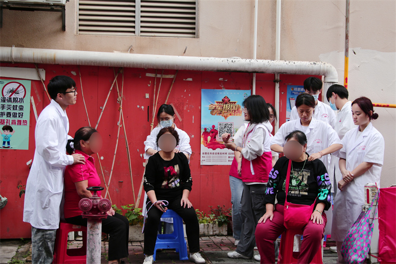 活动现场气氛热烈,居民们闻讯而来,各服务区域前都围满了前来体验的居民,温馨融洽的氛围感染着在场每一个人。血压测量区内,志愿者细致地为居民记录血压数据,结合检测结果耐心科普日常血压监测要点与基础保健技巧;按摩区中,志愿者凭借娴熟的推拿手法,为深受肩颈酸痛、腰背不适困扰的居民舒缓疲劳,并提供个性化养护建议;艾灸体验区内,缕缕艾香萦绕,志愿者深入浅出地讲解艾灸的养生原理与适用场景,让传统中医文化在氤氲香气中浸润人心;刮痧体验区内,志愿者手持刮板规范操作,精准疏通居民经络,随着痧痕显现,居民们眉头舒展、笑容洋溢,中医疗法的独特功效赢得了大家连连称赞。