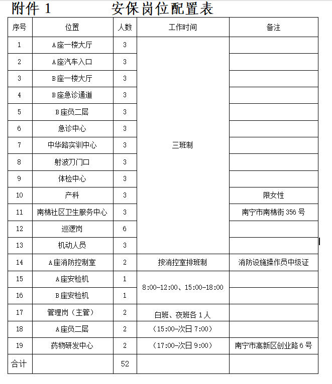四、人员配备:52人(安保岗位配置表详见附件一)