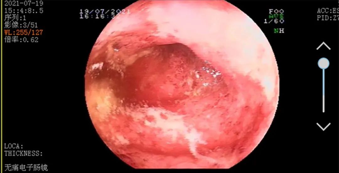 ▲初次肠镜检查:结肠处粘膜粗糙潮红,见大量点片状糜烂灶及溃疡