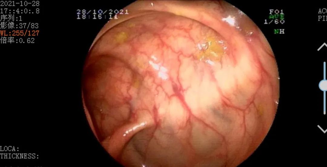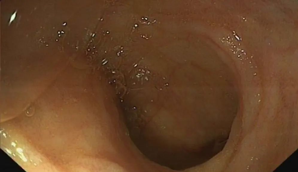 ▲肠镜复查(第14周):肠腔形态正常,黏膜粗糙,未见糜烂及溃疡改变