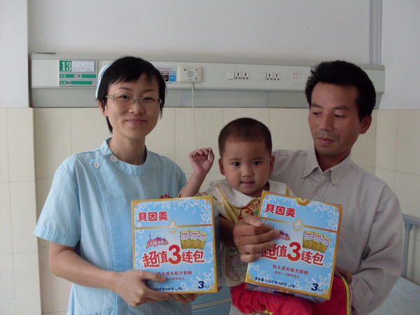 心胸外科护士长张红将奶粉送给即将出院的小病友