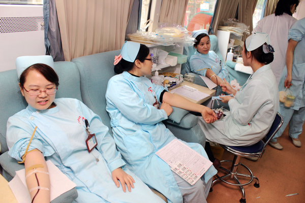 我院心胸外几名护士正在献血车上为春发互助献血