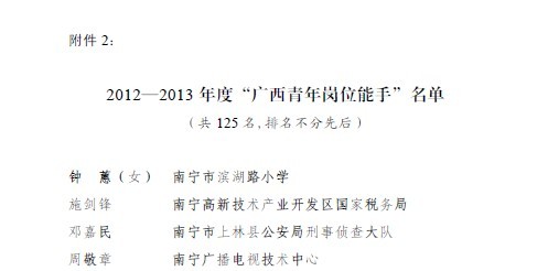近日,共青团广西区委、自治区人力资源和社会保障厅公布了2012-2013年度广西(杰出)青年岗位能手名单。经过层层评选,我院赵立春荣获2012-2013年度广西(杰出)青年岗位能手荣誉称号(全区10名),叶修廷荣获2012-2013年度广西青年岗位能手荣誉称号(全区125名)。