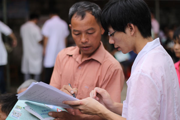 7月20日,瑞康医院博士专家团在大新县中医院举行大型义诊活动。广西中西医结合学会秘书长李方教授、医院副院长黄国东教授、大骨科主任陈锋教授、空港院区内一科主任王强教授、妇科李林教授、肾内风湿免疫科主任黄仁发副教授、神经外科主任范学政副教授、儿科副主任李日东副教授、消化内科副主任张涛副教授、医疗服务部主任何颖参加了本次义诊。闻讯赶来的群众早早等在义诊现场,不多时便排起了长龙。专家们认真地听病人讲述病情,耐心地为病人分析病情、开具处方,针对性地提出了治疗和康复的意见。现场病人纷纷向医生索要了联系方式以便病情的后续询问。大学生志愿者们认真地给当地居民量血压,贴心的将数据记录在小册子上发给群众,并协助专家进行义诊。此次义诊活动不仅让大学生完成了理论联系实际的过程,巩固了课本上的理论知识,掌握了医疗技术的基本技能操作,同时也锻炼了大学生的交流能力、丰富了社会阅历。