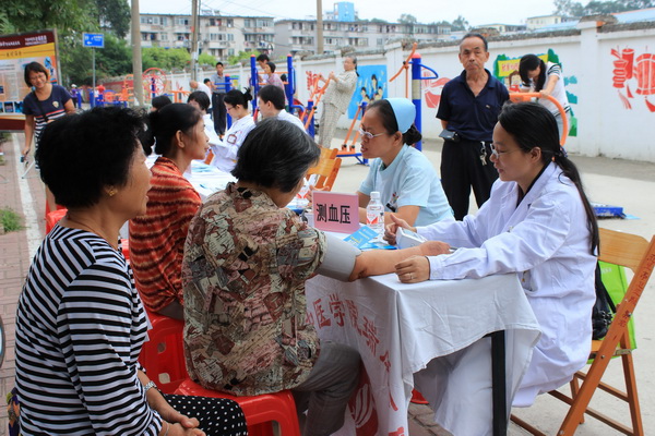 医务人员为群众测量血压