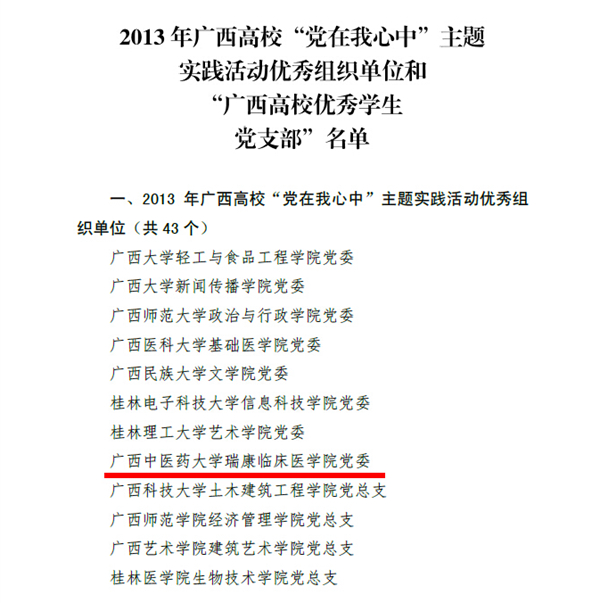 近日,自治区高等学校工作委员会传来喜讯,我院瑞康临床医学院党委获评2013年度广西高校“党在我心中”主题实践活动优秀组织单位。