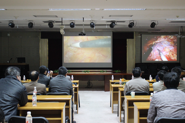 邕城12月的寒流挡不住学员们学习的热情,12日下午2时许,精准腹腔镜结直肠癌手术现场演示在我院23楼会议厅举行。中南大学湘雅医院刘蔚东教授为大家演示了腹腔镜右半结肠癌CME根治术,我院胃肠外科韦建宝主任则带来了腹腔镜低位直肠癌根治术(Dixon术式)。广壮族西自治区人民医院冯泽荣主任作为当天下午的主持,在现场为手术做解说点评,深入浅出地解答了到场学员的问题。手术过程中,专家们通过通讯技术现场实时交流,切磋“手上功夫”,颇有“华山论剑”的架势,令在场学员直呼过瘾。