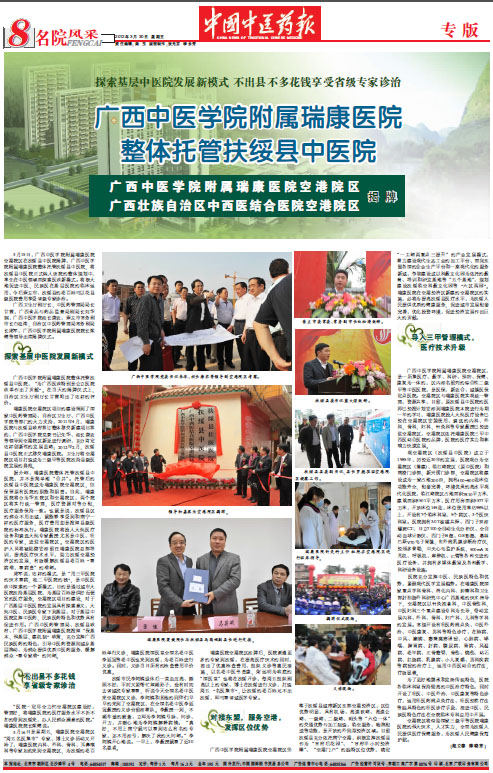 3月15日,广西中医学院附属瑞康医院空港院区在扶绥县中医院揭牌,广西中医学院附属瑞康医院整体托管扶绥县中医院,将扶绥县中医院正式纳入医院的整体规划中,率先在中医领域里探索医改新模式。区内外媒体对我院空港院区的成立进行了多方位的报道,《中国中医药报》3月30日以《探索基层中医院发展新模式,不出县不多花钱享受省级专家诊治——广西中医学院附属瑞康医院整体托管扶绥县中医院》为题,整版报道了此次活动。
