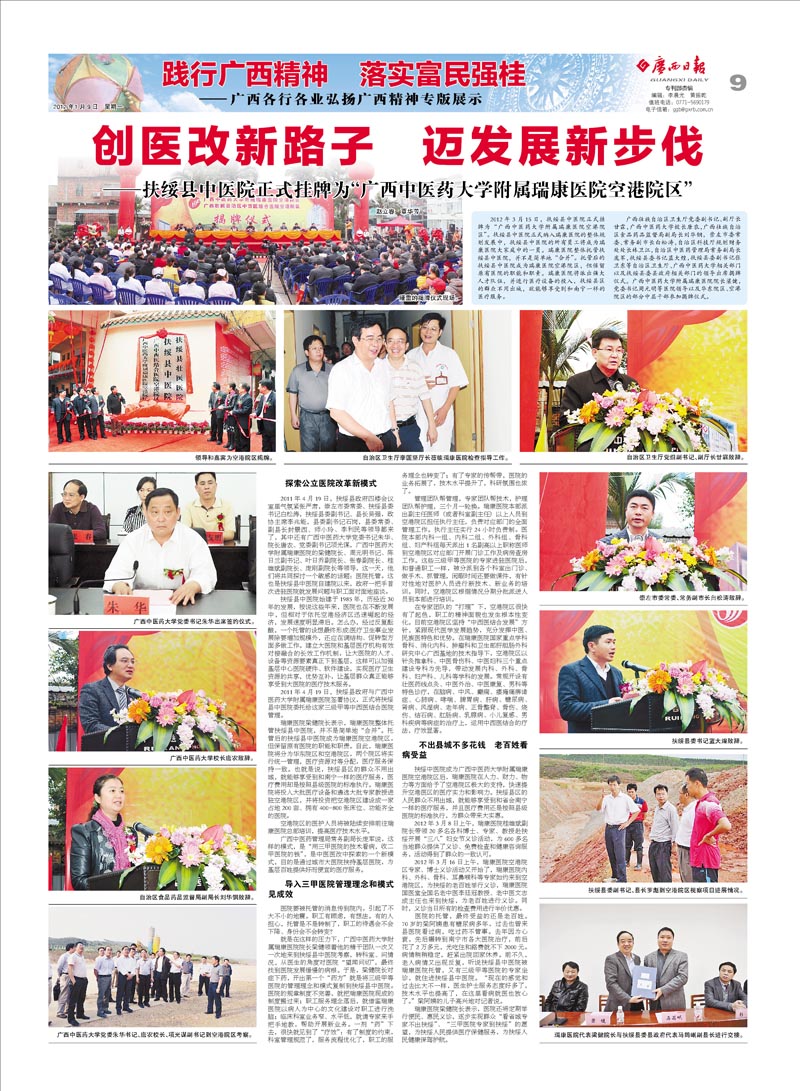 3月15日,瑞康医院空港院区在扶绥县中医院揭牌,瑞康医院将扶绥县中 医院正式纳入医院的整体规划中,率先在中医领域里探索医改新模式。区内外媒体对我院空港院区的成立进行了多方位报道,《广西日报》4月19日《创医改新路子 迈发展新步伐——扶绥县中医院正式挂牌为“广西中医药大学附属瑞康医院空港院区”》为题,整版报道了此次活动。
