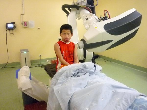 2012年5月4日早上,在瑞康医院住院的男孩国国的巨舌接受了一次“射波刀”的治疗,就不流口水了。国国父亲看到这一幕,脸上露出了笑容。