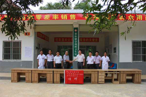乡镇卫生院与村卫生室实行统一规划、统一建设、统一管理是医疗卫生体制改革的一项重要内容。渠旧镇是扶绥县第一批实行乡村卫生一体化建设的乡镇。为了支持该镇乡村卫生一体化建设,2012年7月10日,我院空港院区向渠旧镇崇边村卫生室捐赠办公桌椅一批。图为空港院区工作组韦兴中组长(左四)与县卫生局吴善德局长(右四)在捐赠仪式上。