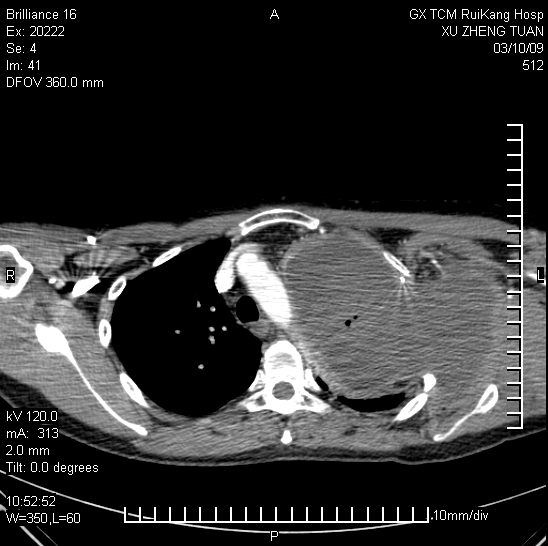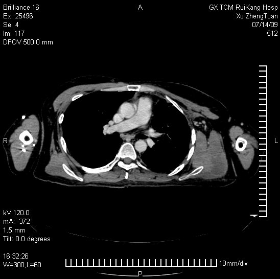 至今历时2年半时间,经过3次CT和磁共振检查,均提示该肿瘤逐渐缩小,最后一次复查(2011年8月15日CT)见肿瘤已经缩小至5cm×3cm,仍为坏死组织,左肺已经完全复张,左上肢功能已经完全恢复,没有发现新病灶。