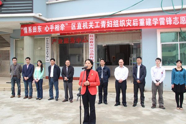 2013年3月14日,区直机关工委组织财政厅、农业厅、卫生厅、广西中医药大学附属瑞康医院等八家单位的志愿者到田东县朔良镇开展“情系田东 心手相牵”地震灾后重建学雷锋志愿服务活动,为灾区群众送去农业生产物资和卫生药品,并开展免费义诊和农业技术培训活动。我院团委积极组织本次活动,在启动仪式上,医院团委专职副书记叶修廷代表医院向朔良镇受灾群众捐献价值2000元的药品,我院医生志愿者还深入到受灾最严重的六羊村六里屯,在受灾群众安置点为村民看病。