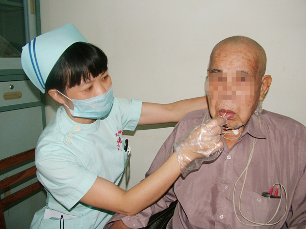 为了让黄老恢复吞咽功能,康复专家为他制定了一套中西医结合康复方案。中医方面给予中药冰药棒刺激,西医方面进行电动牙刷震动刺激,舌肌抗阻训练,舌肌上下肌群力量训练,唇运动训练,软腭运动训练,声带功能训练,咀嚼功能训练等。
