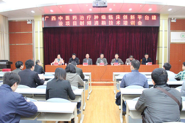 随后,我院肿瘤科练祖平主任在会上发言,他表示,广西中医药治疗肿瘤临床创新平台建设项目作为自治区中医药管理局重要项目之一,该项目的启动会已定于3月28日—30日,届时,国家中医药管理局相关领导将出席会议。同时他介绍到,广西中医药治疗肿瘤临床创新平台建设项目主要分为技术创新和中医药创新两大板块:一、技术创新板块包括射频消融技术和射波刀治疗肿瘤技术。二、中医药理法方药的辨证论治,由于近几年在肿瘤治疗方面西医已经达到一个瓶颈状态,目前中医是大家所期望的一个治疗手段,希望通过两大创新技术的结合,肿瘤治疗能在中医的参与下与西医优势互补、协同创新,取得“延长生存期,提高生活质量”的新突破。在培训期间他要求学员们按时参加培训课程,学习过程中互相协调,共同促进。