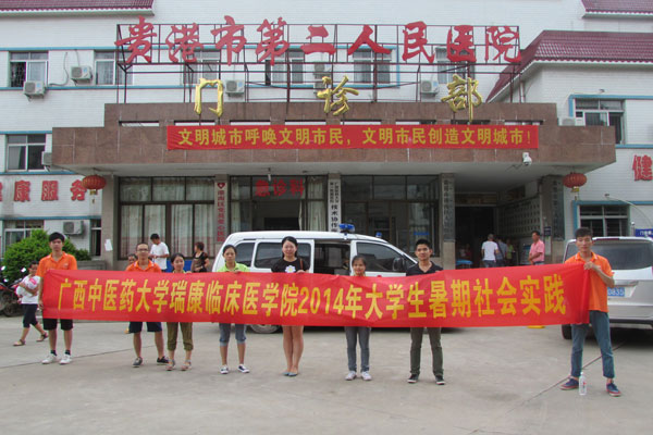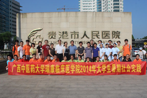 2014年7月17日至7月18日,瑞康临床医学院团委和教务学生部赴贵港市人民医院开展了以“践行核心价值观•实现别样青春梦”为主题的大学生暑期社会实践系列活动。广西中医药大学副校长戴铭,瑞康临床医学院党委副书记、纪委书记陈日兰,副院长黄国东,医院专家博士团,以及教务学生部、团委和学生代表共34人参加了本次暑期大学生社会实践活动。