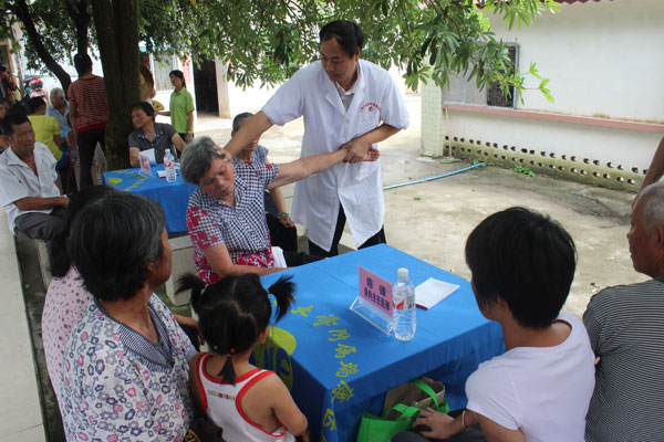 在桥圩村的村委会,我院专家与贵港市人民医院专家还开展“结对下基层,服务老百姓”联合义诊活动。我院骨科陈锋主任,妇科李林主任,教务学生部莫启章主任参与了本次义诊。同时,大学生实践队员在义诊现场对当地村民进行传染病防治知识的宣教和发放宣传单、宣传册。