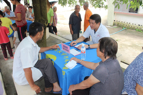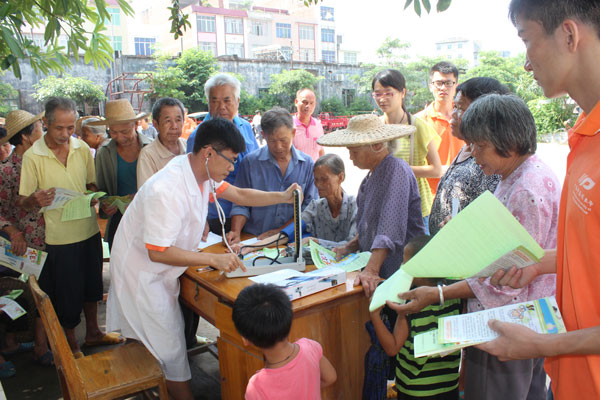 大学生实践队员在给村民量血压和发放传染病防治知识小册子