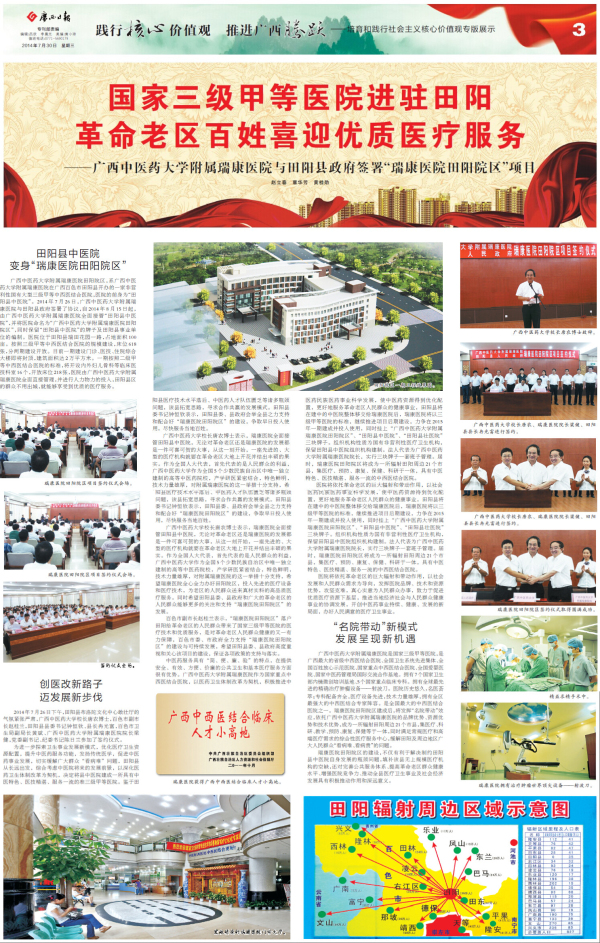 区内媒体对我院田阳院区的成立进行了多方位的报道,《广西日报》7月30日以《国家三级甲等医院进驻田阳 革命老区百姓喜迎优质医疗服务——广西中医药大学附属瑞康医院与田阳县政府签署“瑞康医院田阳院区”项目 》为题,整版报道了此次活动。