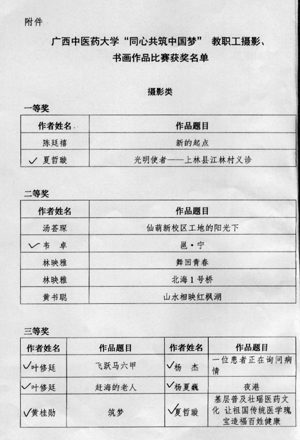 为加强学校精神文明建设工作,展现广大教职工丰富的校园文化生活,抒发教职工的爱国荣校之情,促进和谐校园文化建设,广西中医药大学于今年4月举办“同心共筑中国梦”教职工摄影、书画作品比赛,用摄影、书画艺术形式表现“中国梦▪劳动美”的主题宣传教育,搭建教职工间摄影、书画创新与交流的平台。作为校附属单位,我院工会积极响应,号召广大职工踊跃参与,达到了提高职工综合素质、促进精神文明建设的目的,并充分展示了我院职工勇于开拓创新、无私奉献的精神风貌。