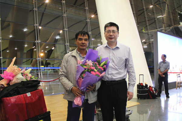 接机队伍怀着无比激动的心情早早地等待在出站口,并紧紧地盯着出站大屏幕,时间一分一秒地过去,18:59接机队伍忽然沸腾起来,面带微笑的援外医疗队员陆续从乘客出口通道走出,我们也终于盼来了久别两年的王宗善与姚彦文两位专家。欢呼声伴随着掌声,鲜花与微笑,热情地握手和紧紧地拥抱,在场的所有人都被久别重逢的喜悦感染了。