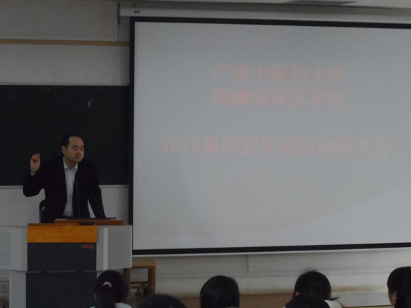 12月28日下午,瑞康临床医学院2015届毕业生就业动员大会在广西中医药大学明秀校区西梯二教室召开。瑞康医院党委副书记、纪委书记陈日兰和瑞康临床医学院全体辅导员出席本次会议。2015届瑞康临床医学院全体毕业生参加了会议。